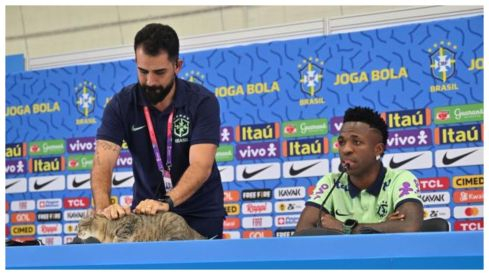 Mientras que Vinicius era sometido a las preguntas de la prensa internacional en sala de prensa, llegó un invitado que nadie esperaba que ha causado estragos en Brasil. Para muchos era una cosa adorable, para otros alguien que se había colado donde no correspondía.