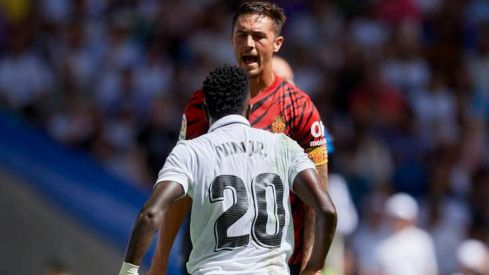 Ambos futbolistas se enzarzaron por primera vez en el momento en el que Vini reclamó un penalti del futbolista bermellón tras una caída en el área. El brasileño se levantó y el capitán del Mallorca se fue a por él, empujándole y viendo la cartulina amarilla. Después del encontronazo, el jugador merengue le decía algo con la boca tapada a su rival.