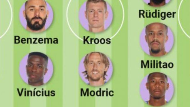 Thibaut Courtois; Dani Carvajal, Eder Militão, Antonio Rüdiger, David Alaba; Fede Valverde, Toni Kroos, Luka Modrić, Eduardo Camavinga; Vinicius Junir y Karim Benzema.
