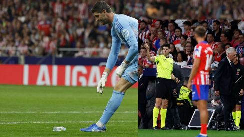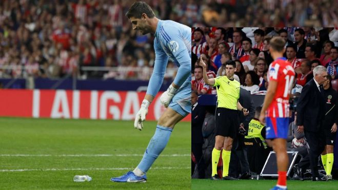 Después de llevar aguantando cánticos deseándole la muerte, Courtois celebró el gol de Militao girándose a la grada, lo que fue respondido por una lluvia de objetos. Mecheros y botellas de agua llenaron el césped del feudo rojiblanco en una imagen lamentable, que obligó a parar durante unos minutos el encuentro.