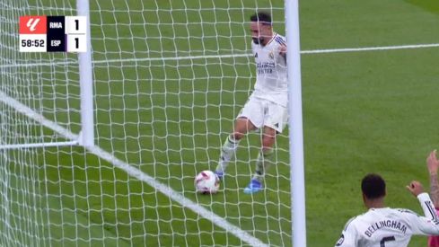 Tras una gran acción individual de Jude Bellingham, Dani Carvajal remató a puerta vacía con mucha rabia, principalmente porque iban abajo en el marcador, pero también por el accionar del colectivo arbitral, quien ha mostrado unas tarjetas amarillas a los merengues verdaderamente surrealistas.